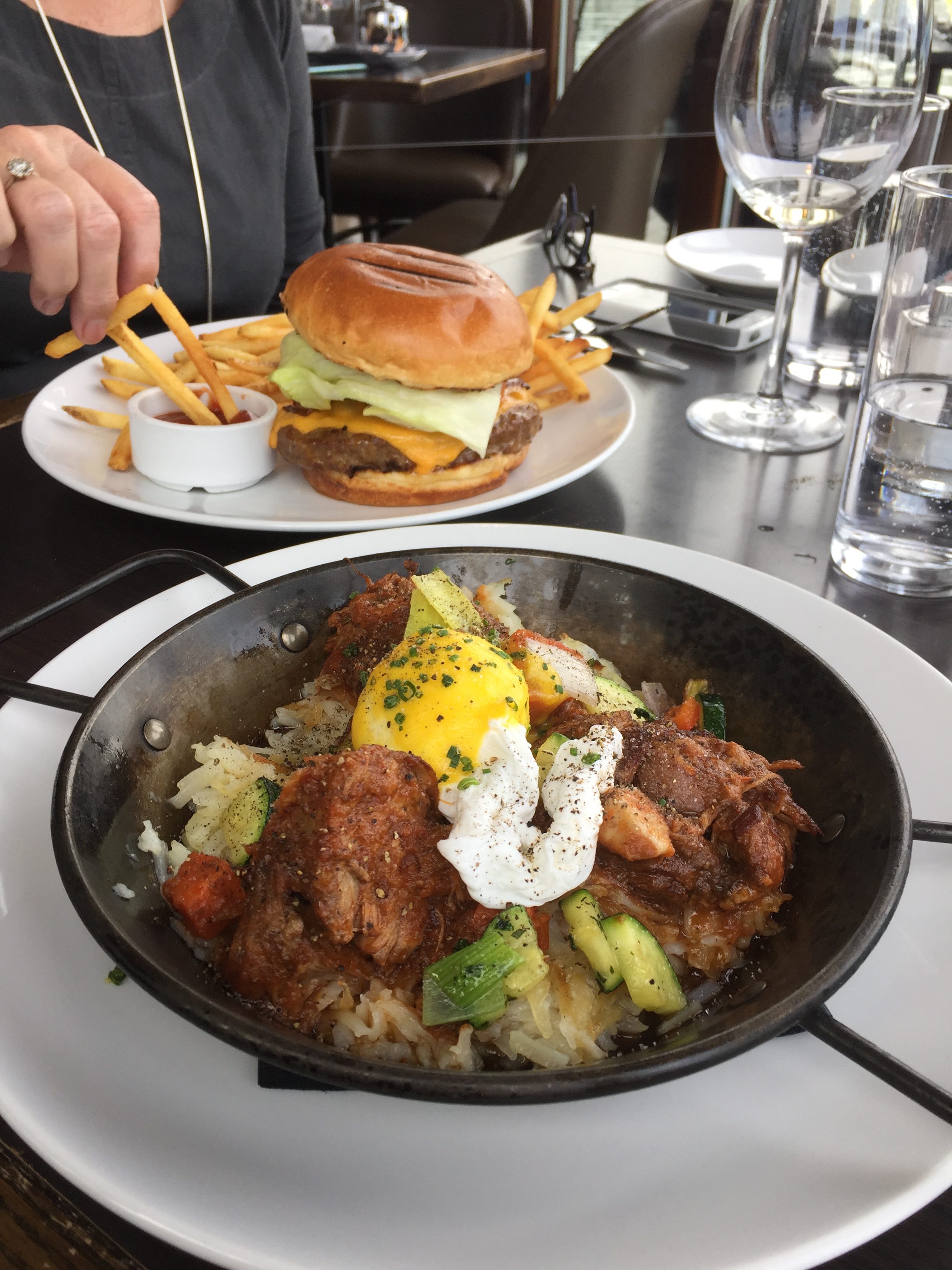 Our server was a briskly chatty young middle-aged lady who was prompt and full of speedy banter which didn’t delay her getting things done. We started out with six tempura prawns with a spicy mayonnaise which were crispy and tender as one would hope and benefited from the mayo. Robin went for the burger with its caramelized onion etc. and thin professionally-crispy fries. Mine was their lamb hash, chunks of braised lamb shoulder which were adequately moist, along with some ratatouille, shredded potato called hashbrowns (but really just cooked strings) and a nice soft fried egg on top of everything. Once we got salt and pepper on it this was a completely satisfying match for my substantial appetite.