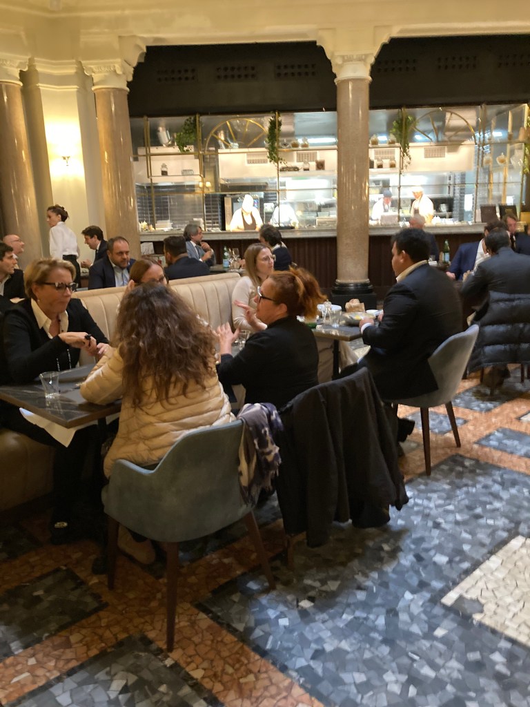 Waiters were relaxed young guys who spoke colloquial English and went about their business with speedy efficiency. The lady who brought the wine barely spoke any English but was cheerful and engaging. Other tables had family groups, business people, and happy couples behaving like it was just another lunch. The room was noisy but pleasant, and I’ve started to distinguish between benign this kind of cheerful chatty noise and the shrieking and clattering you get in some upscale places in North America.
